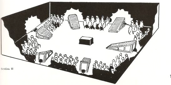 Topluluk gelişip ünlenmeye başlayacak olursa daha çok sayıda izleyiciye görünmek istiyor, o zaman da gösterisini standart, sahneli bir salonda düzenlemek zorunda kalıyor. Bu da dördüncü duvarı açık bir kutunun içinde, sağdan soldan tiyatrovari giriş çıkışlarla dansetmek, kendini yalnızca bir açıdan izlettirmek, yani açık stüdyodaki seçeneklerin büyük ölçüde kısıtlanması anlamına geliyor. Topluluk “geliştikçe” daha büyük ve daha kurumlaşmış mekanlara geçiyor, iş daha çok sayıda insanın, daha uzaktan izlediği gösterilere dönüşüyor. Gösteri giderek “sinemalaşıyor,” “insan insanalığını” yitiriyor diyebilirim. Standart mimari, gösteriyi standartlaşmaya zorluyor: İzleyen göz sayısı arttıkça seçenekler ve yenilik yapma ya da aykırılaşma olasılıkları azalıyor.